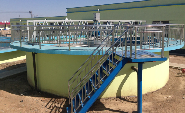 3.該機主要由主梁、中心支座、傳動裝置、刮臂、底部刮板、浮渣刮板、穩流筒、浮渣漏斗等部件組成。由池中心的支墩和池沿上行走的車輪支承主梁,主梁的中心與在中心支墩上的中心支座鉸接,兩端裝有包括減速機在內的傳動裝置。該機以支墩上的中心支座為軸沿池圓周作回轉運動。在主梁下部裝有刮集裝置,底部的刮泥板將池底的污泥刮到池中心的排泥槽內,由下端的泥斗刮板經排泥槽將污泥排出池外。